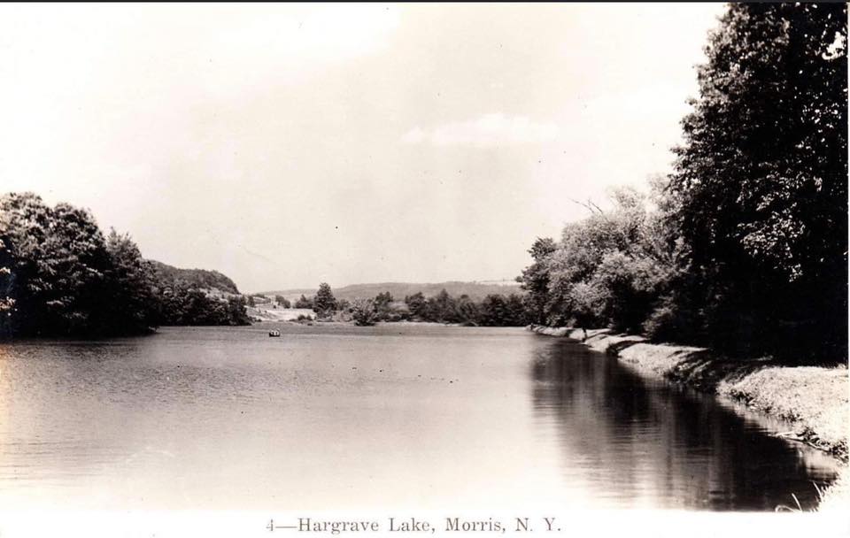 This painting by A.S. Avery shows the red grist mill on Hargrave Lake mid 19th century.