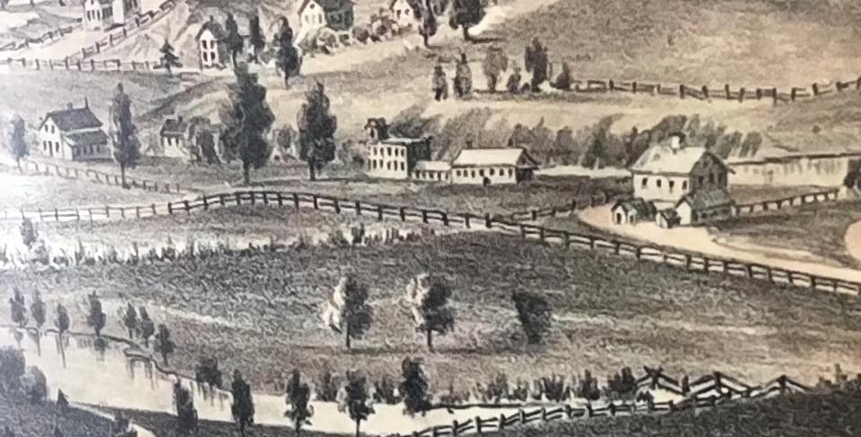 A little more than a decade later, Civil War veteran Andrew Turner would tear down the gristmill to build barns behind his house on Mill Street (bought from his estate, dismantled by Pickens because of the creek washing out where they stood). Phillips & Nichols purchased the relatively new creamery in Haiti, just over the line in Pittsfield, and rebuilding that on the gristmill site, turning into a cooperative cheese factory during the Borden’s strike until about 1919, when it became cold storage for the Linn company. Bunn’s took down the cheese factory building about 1978? A.S. Avery displayed his birdseye view of the village at the 1884 fair, and that is the only other known depiction of what stood on the tractor plant site before it was built. The gristmill is at right. The only building lost to fire in the village between the 1850 destruction of the original Hargrave Factory (a three story stone building like other area textile mills), and the c. 1876 loss of John Winton’s sled factory on Water Street, was the original miller’s house, (William Barnes?, English) which had stood the other side of the mill when it was built but removed when the pond was enlarged for the Hargrave factory c. 1830. The new miller’s house served as the original fairgrounds entrance building until c. 1960.