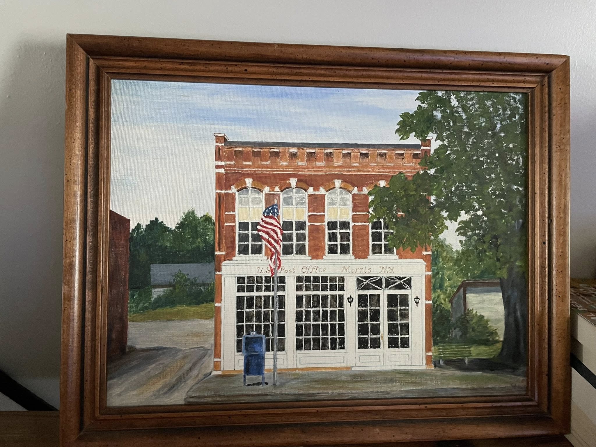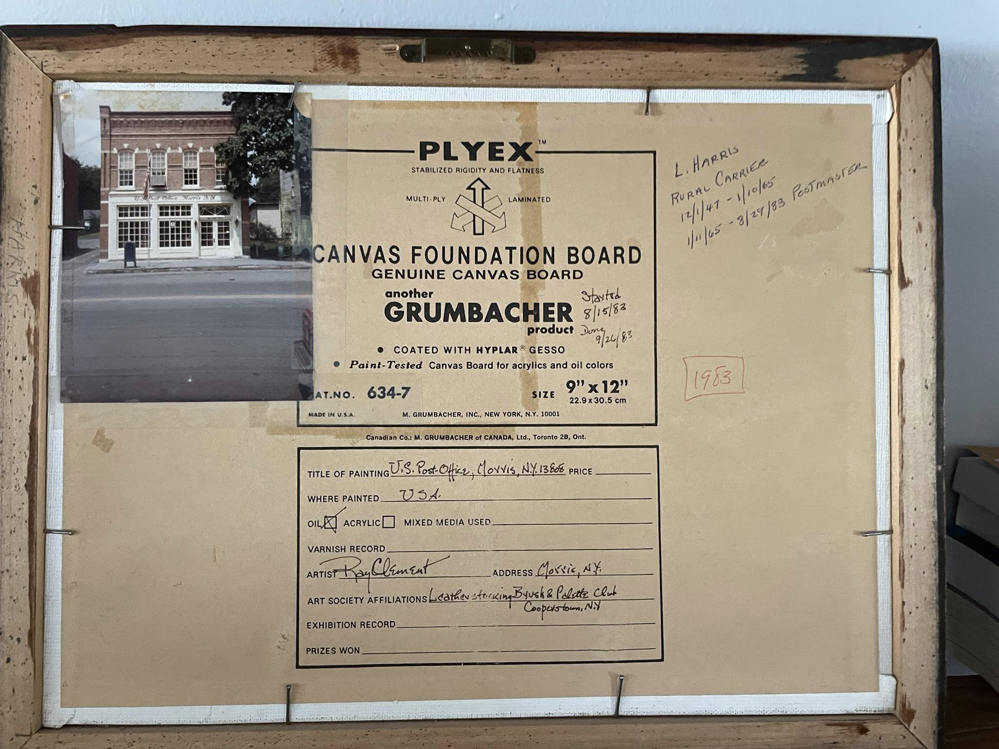 I asked my Godfather, Ray Clement, to paint this picture of the Morris Post Office so I could give it to my father when he retired as Postmaster in 1983. The Kodak photo on the back is what Ray used to paint the building. My youngest daughter Hannah now has the painting in her possession.