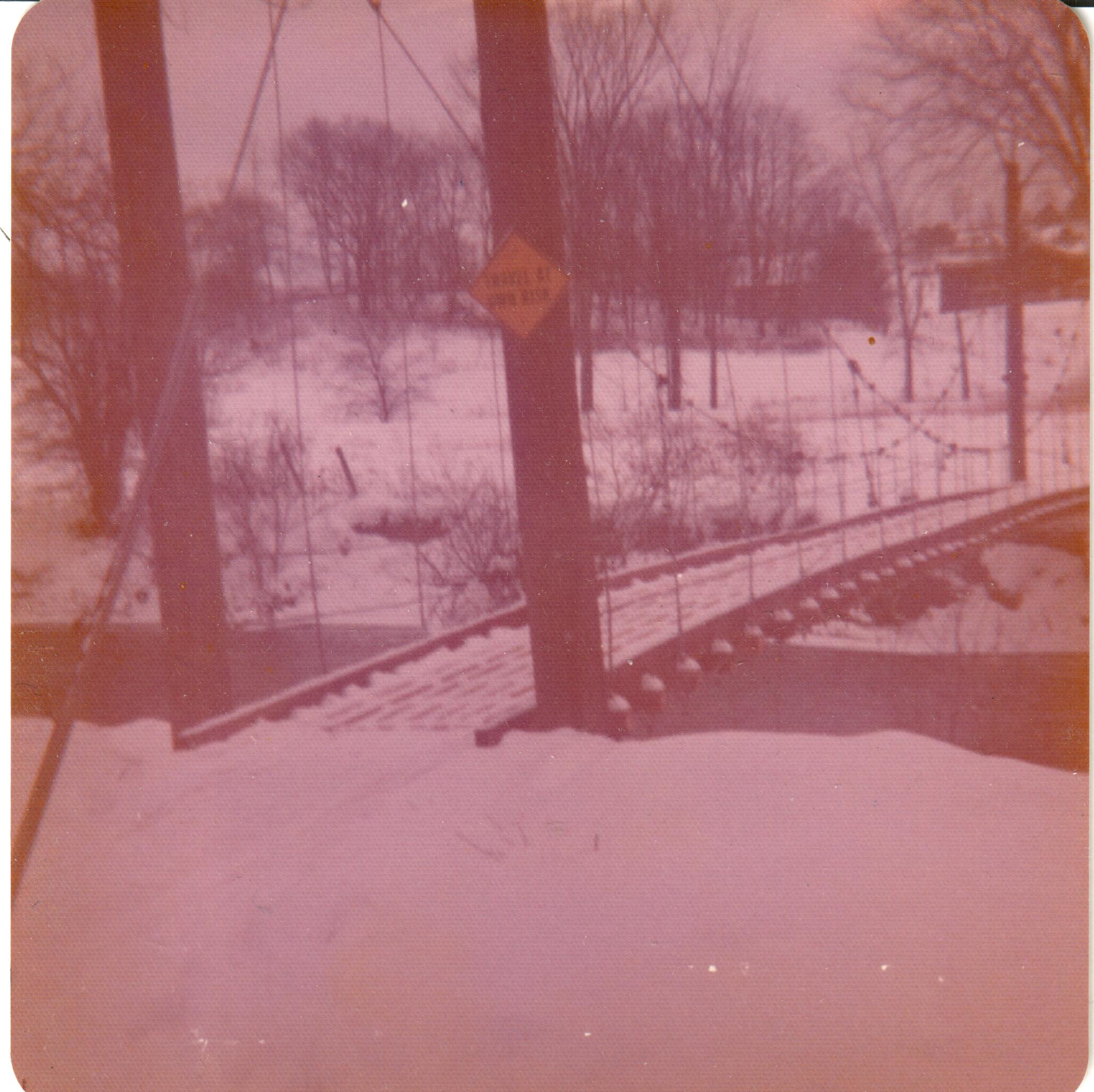 How many people remember walking or snowmobiling across the suspension bridge across the Butternut Creek? It connected Olds Rd with East River Rd. My father, my sister-in-law, and my wife are shown crossing the bridge in this photo that dates to around 1981 or so.